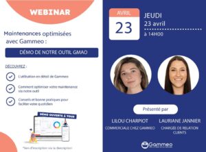Participez à nos webinaires pour approfondir vos connaissances et découvrir comment Gammeo vous aide en matière de maintenance et de gestion du patrimoine. Retrouvez également les replays des webinaires passés à tout moment ! Toutes les informations sont ici.